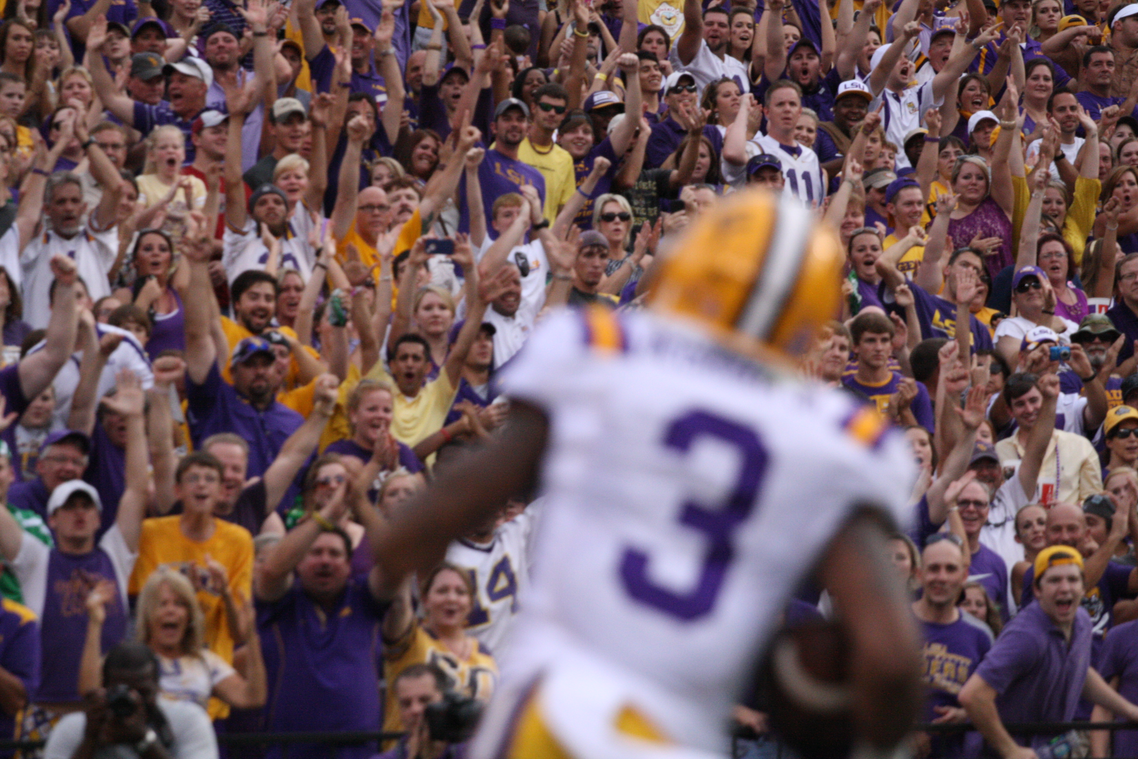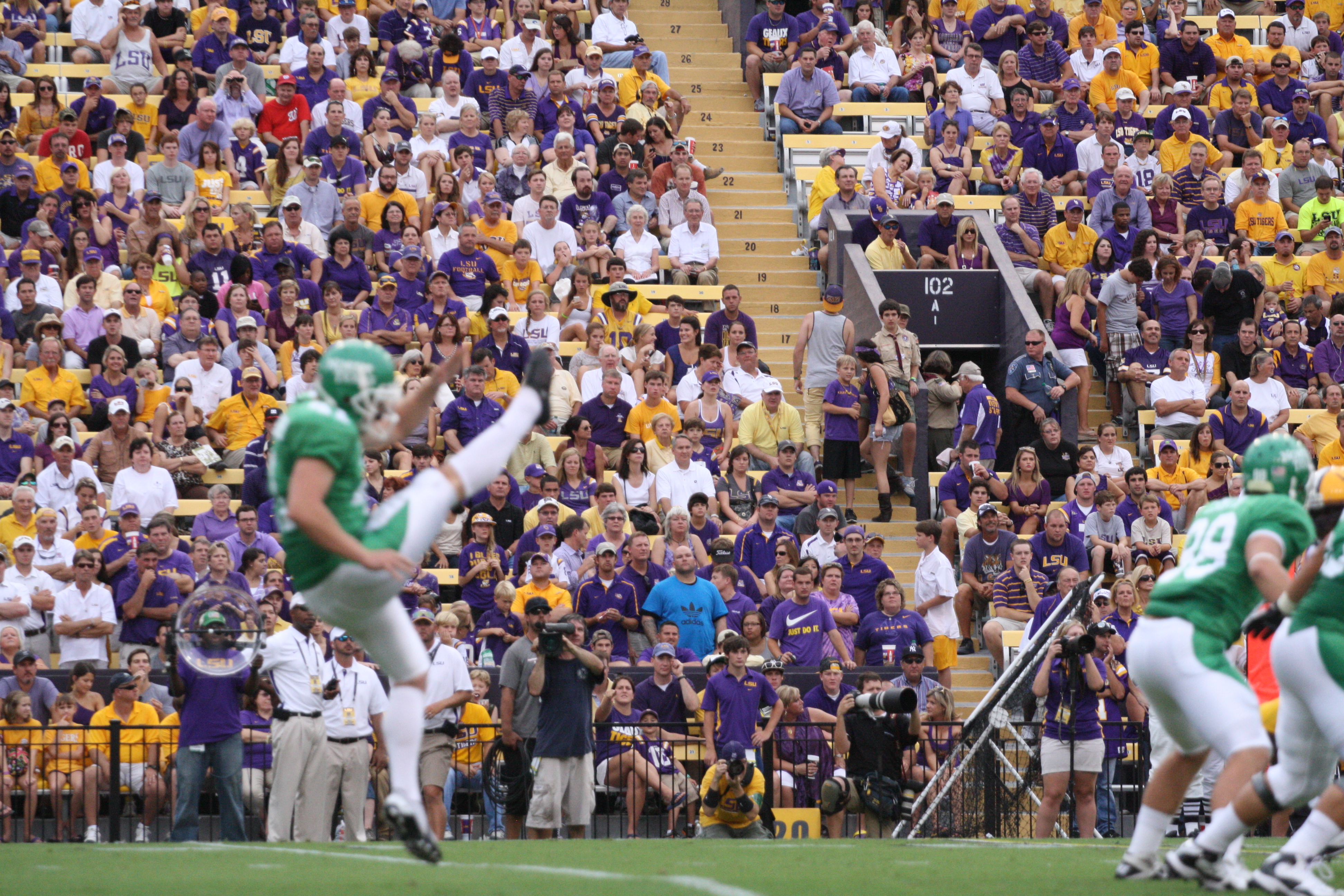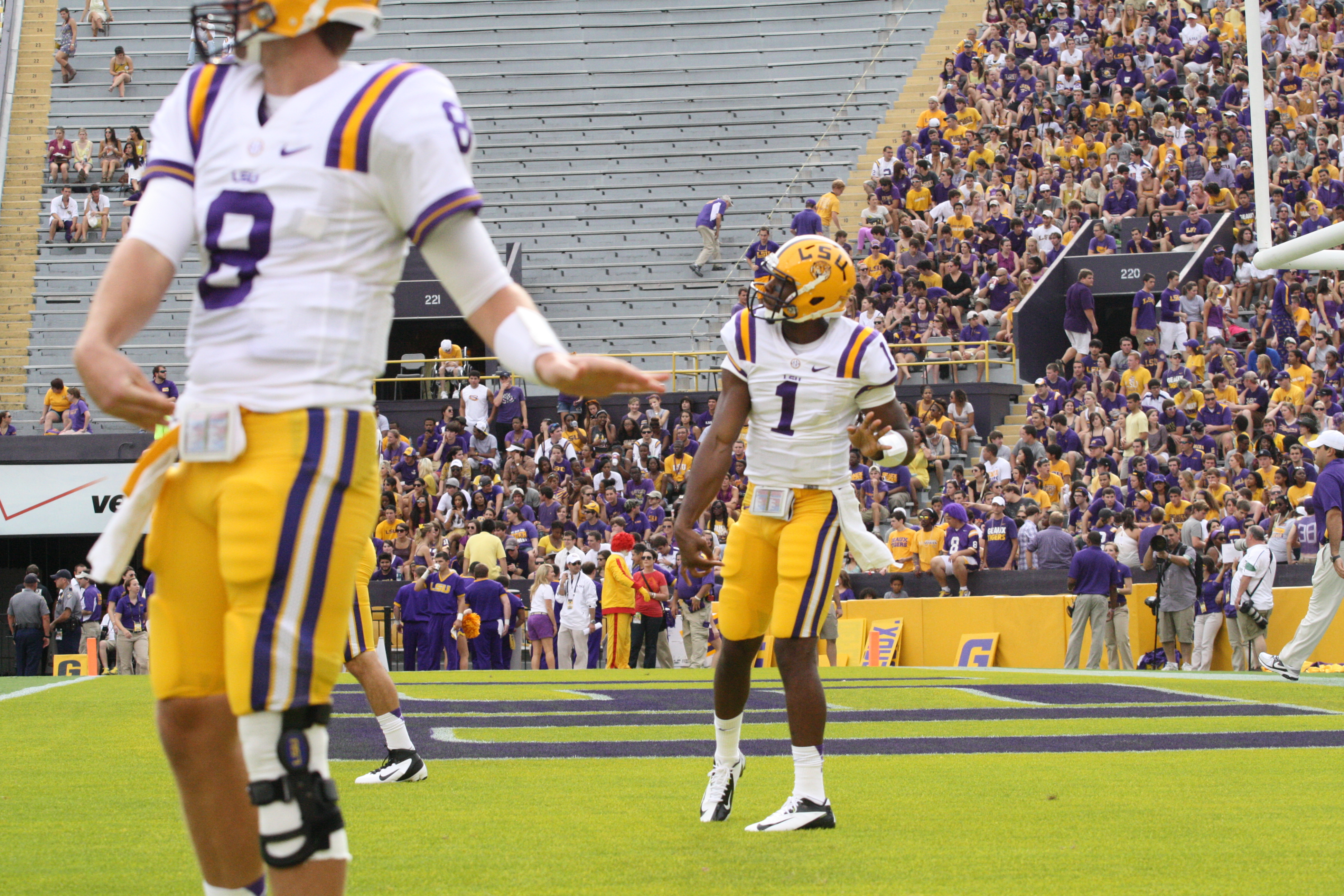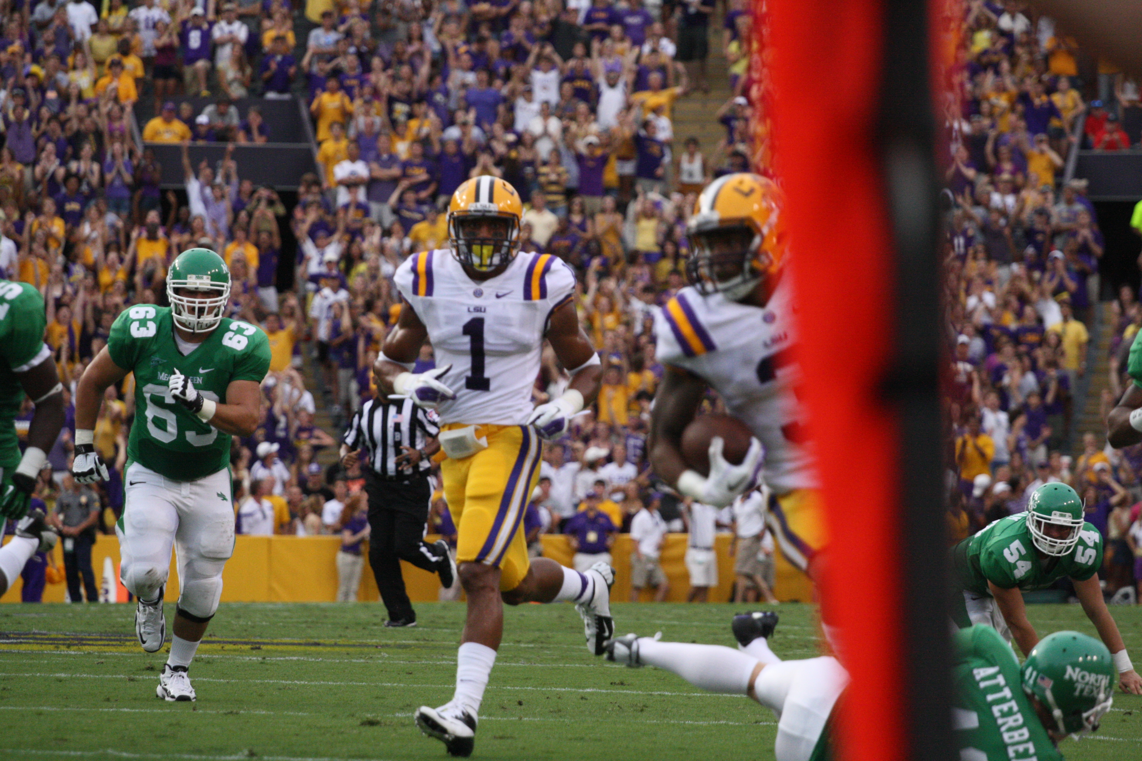 dailycollegefootball.com had a fun time walking the sidelines at the LSU vs North Texas game last night at Tiger Stadium. I t was the first time since 1987 was the last time I watch a game in Tiger Stadium. The game was expected as LSU rolled out to a 24 to 0 lead, one of the touchdowns was Odell Beckham,Jr as he caught a punt from Will Atterberry and return the punt 70 yards for the Tigers second score of the game. Drew Alleman tack on the extra point with Brad Wing holding the kick.